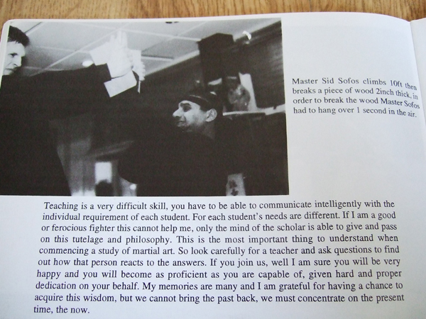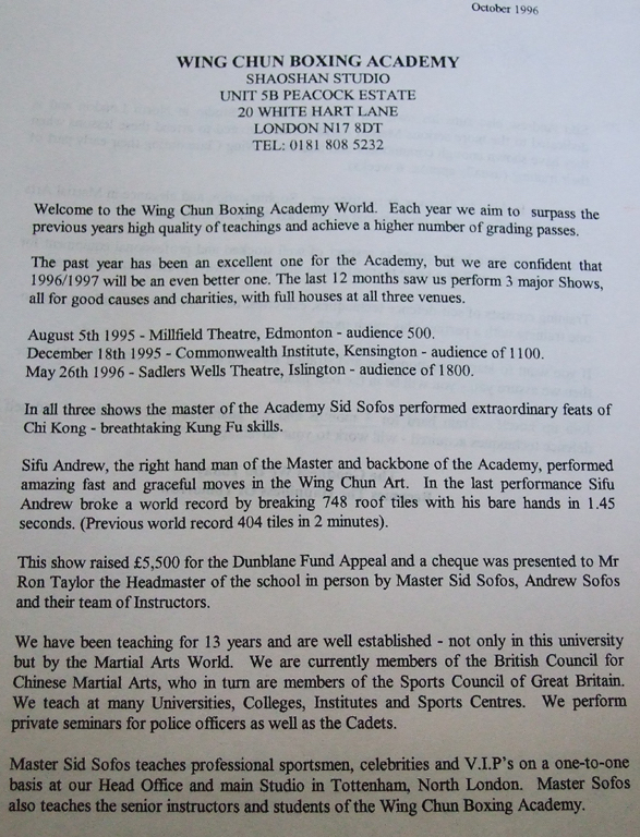 Andrew reputed to hold various world records in martial arts, including the most tiles broken in 2 minutes and the largest number of moves executed on the wooden dummy in a given period of time. The latter, whilst impressive, is perhaps not so as the angles and footwork were flawed and hence it was not really a proper dummy form. The way the Sofos brothers taught the dummy form was to not move around the dummy sufficiently, such that if the arms of the dummy were to extend, the body would be struck and not enough structural strength would be behind the defensive moves to prevent being pushed over backwards. If Andrew did indeed obtain a world record in tile breaking at the Sadler's Wells performance in 1996, it was not officially judged and hence has not been recorded in the Guinness Book of Records or anywhere else. No mention of Andrew's tile record on the internet either. I think that the tiles were pegged (tiles spaced apart and easier to break) as opposed to unpegged, but is not 100% sure. This should have been explained to students or the audience in any case.