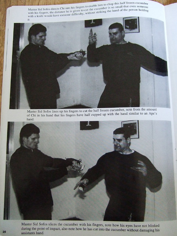 Sid's feat of 'hovering' could perhaps be explained by the temporary slowing in movement when one does a jump at the peak of the jump, perhaps prolonged by a shift of the centre of gravity downwards whilst maintaining a similar position in the air overall for a split second. Sid's description of chipboard being the hardest form of wood to break is probably grossly exaggerated. Sid cites his ability to cut through a half-frozen cucumber with his fingers as evidence of his skill, but it is hard to quantify 'half-frozen', and indeed hard to prove just how frozen a cucumber was unless it was examined by an instructor afterwards, and even then, you would probably have expected a little exaggeration. I'm not saying it wasn't an impressive feat but it's near impossible to verify either way. Perhaps some of the demonstrations performed by Sid and Andrew were reasonably good, but clearly the significance of many were grossly exaggerated and 'sexed' up and made out to be esoteric and much more than they were. Examples of such claims can be found in pictures from one of the school magazines from around late 1993, show below.